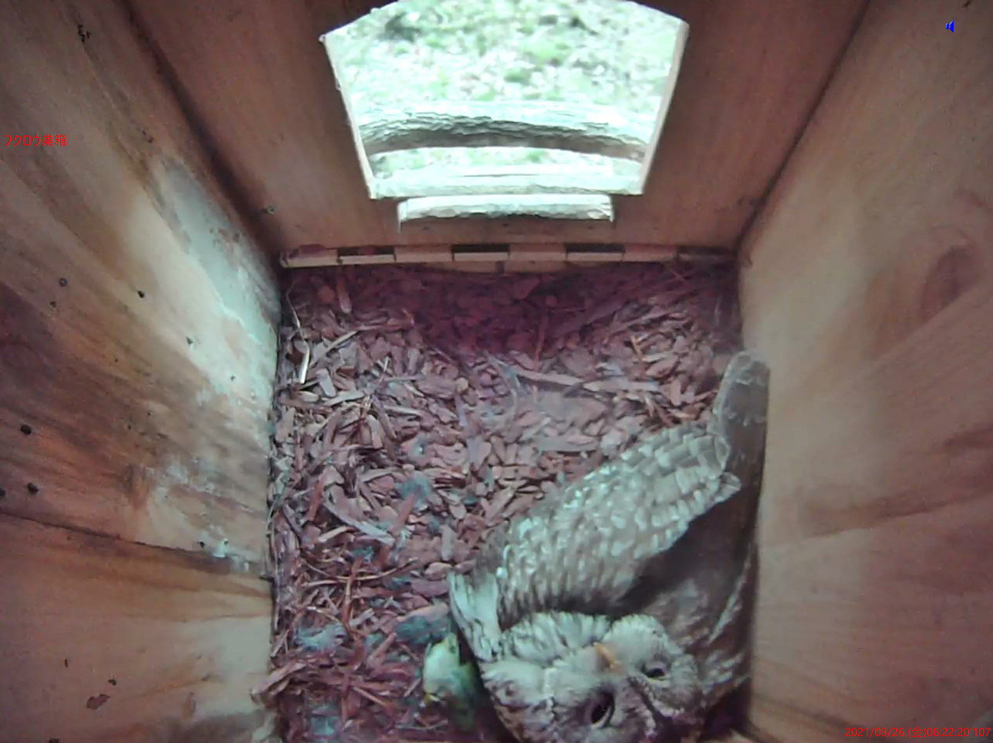 営巣したフクロウの様子 令和3年 谷戸沢処分場 フクロウ巣箱の様子(22) 撮影日時 2021年3月26日 オスフクロウがメジロをつかまえてきました。 ヒナが生まれると、巣箱の中にヒナの食事のために、餌を置いておくようになります。