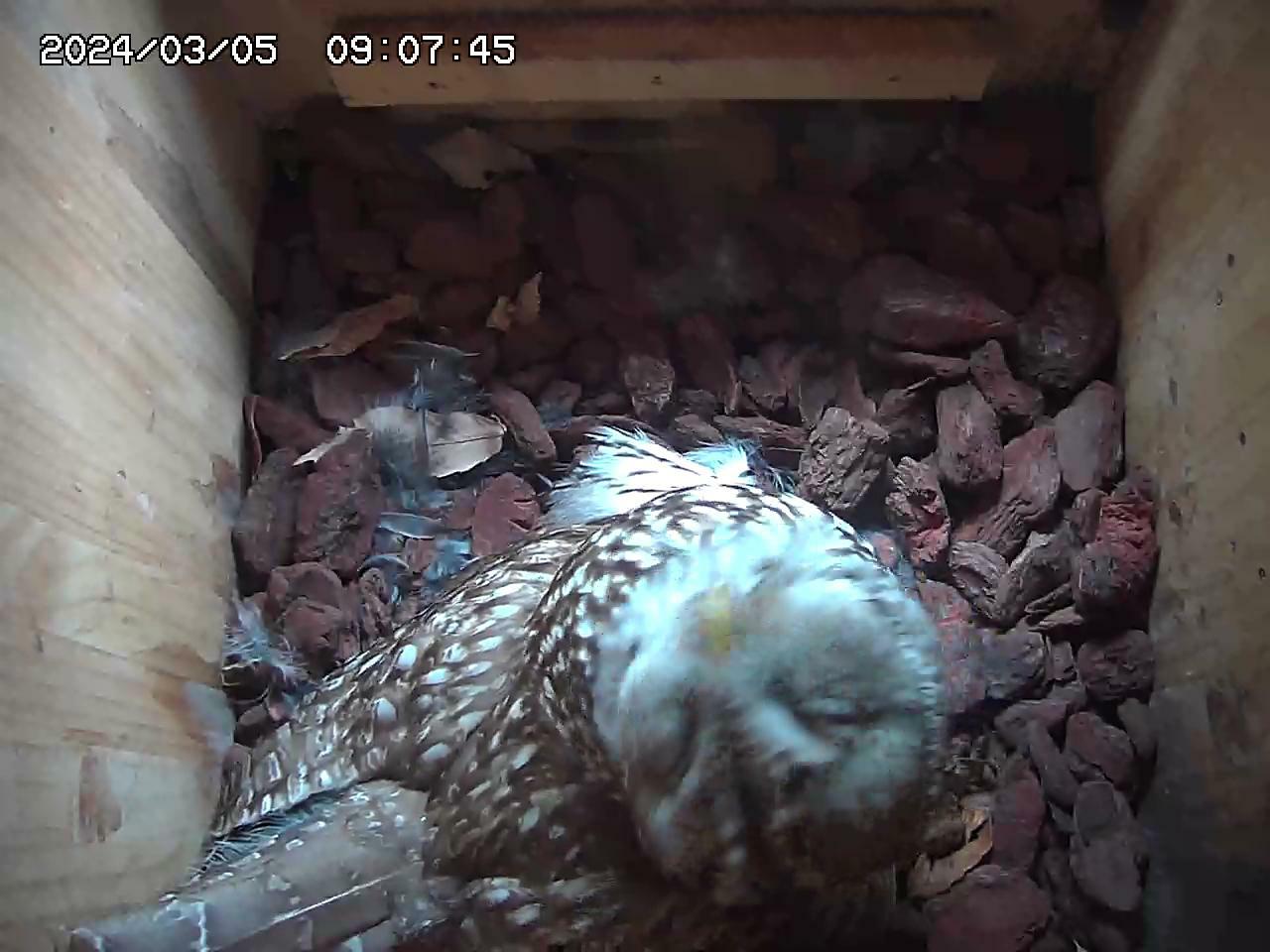 ヒナが生まれて約10日。上を向いているヒナをお母さんフクロウが見守っています。