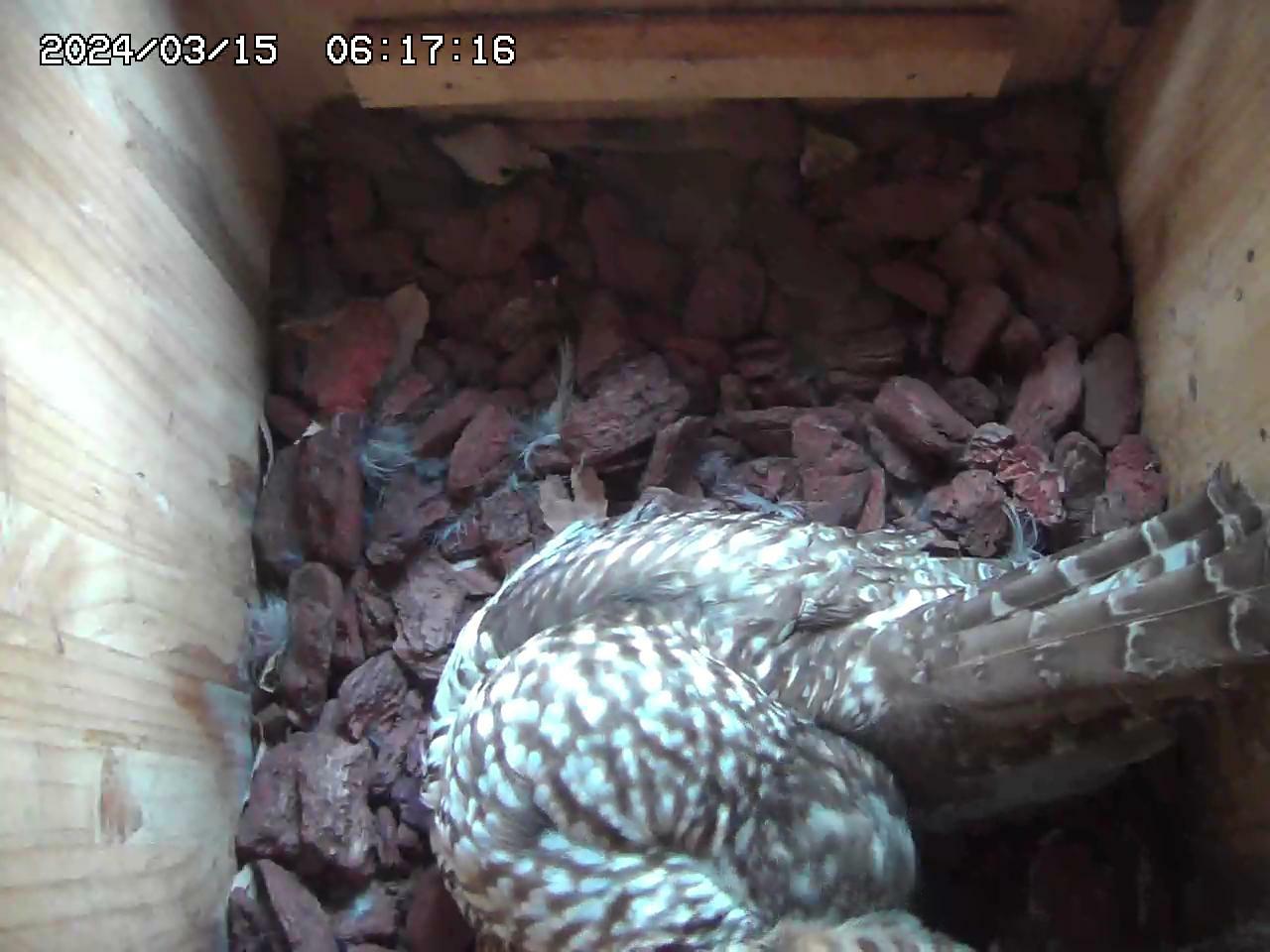 巣箱で抱卵するフクロウ。これから約1か月の長い間、卵をあたため、その後、約1か月ヒナを育てていきます。